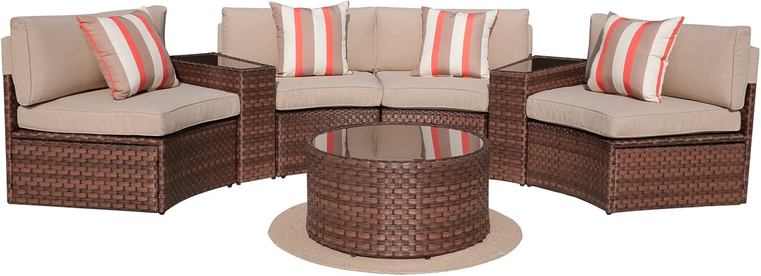 SUNSITT 7 Pieces Patio Furniture Set Outdoor Half-Moon Sectional Set with Waterproof Sofa Cover, Brown PE Wicker & Beige Cushion