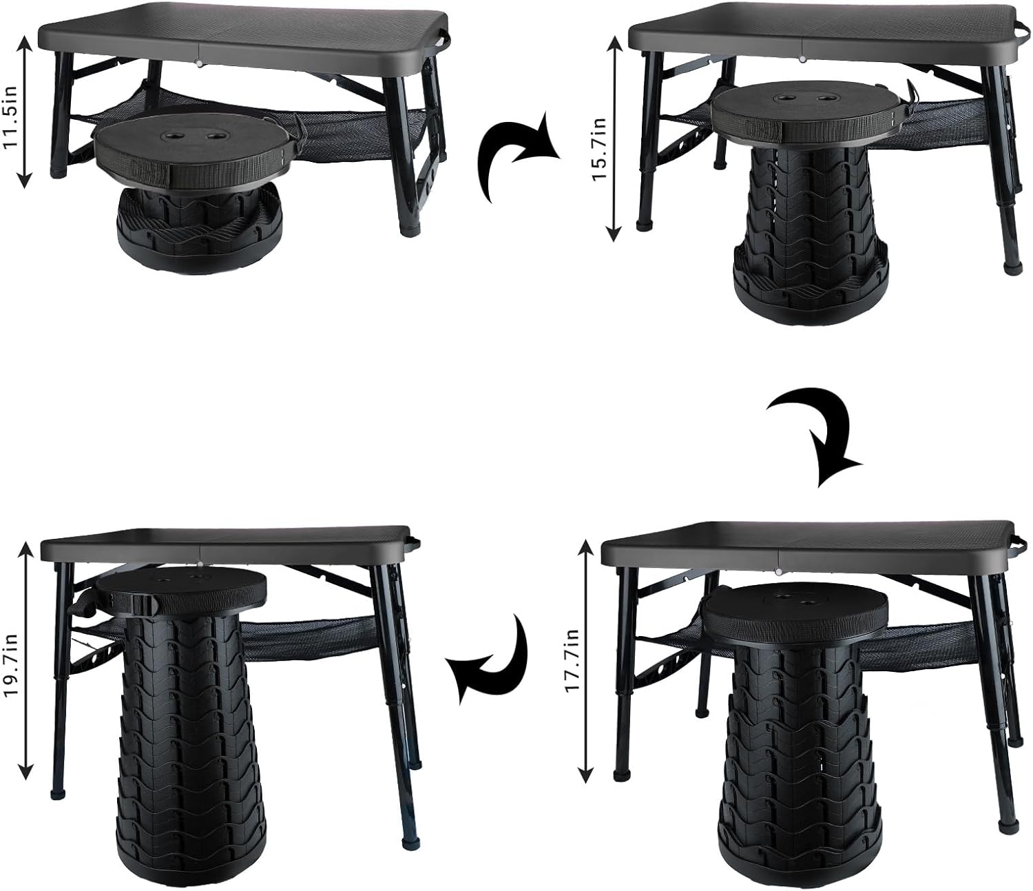 - 2-In-1 Camping Table And Stool: This folding camping tables and telescopic stool chairs can help you go out anytime and anywhere. The collapsible stool can be completely put into the foldable tables, and it is equipped with a handle outside the folding camp side tables. The material is high-quality plastic, it opens very smoothly and will not get stuck like aluminum products, even kids and women can easily open and close.