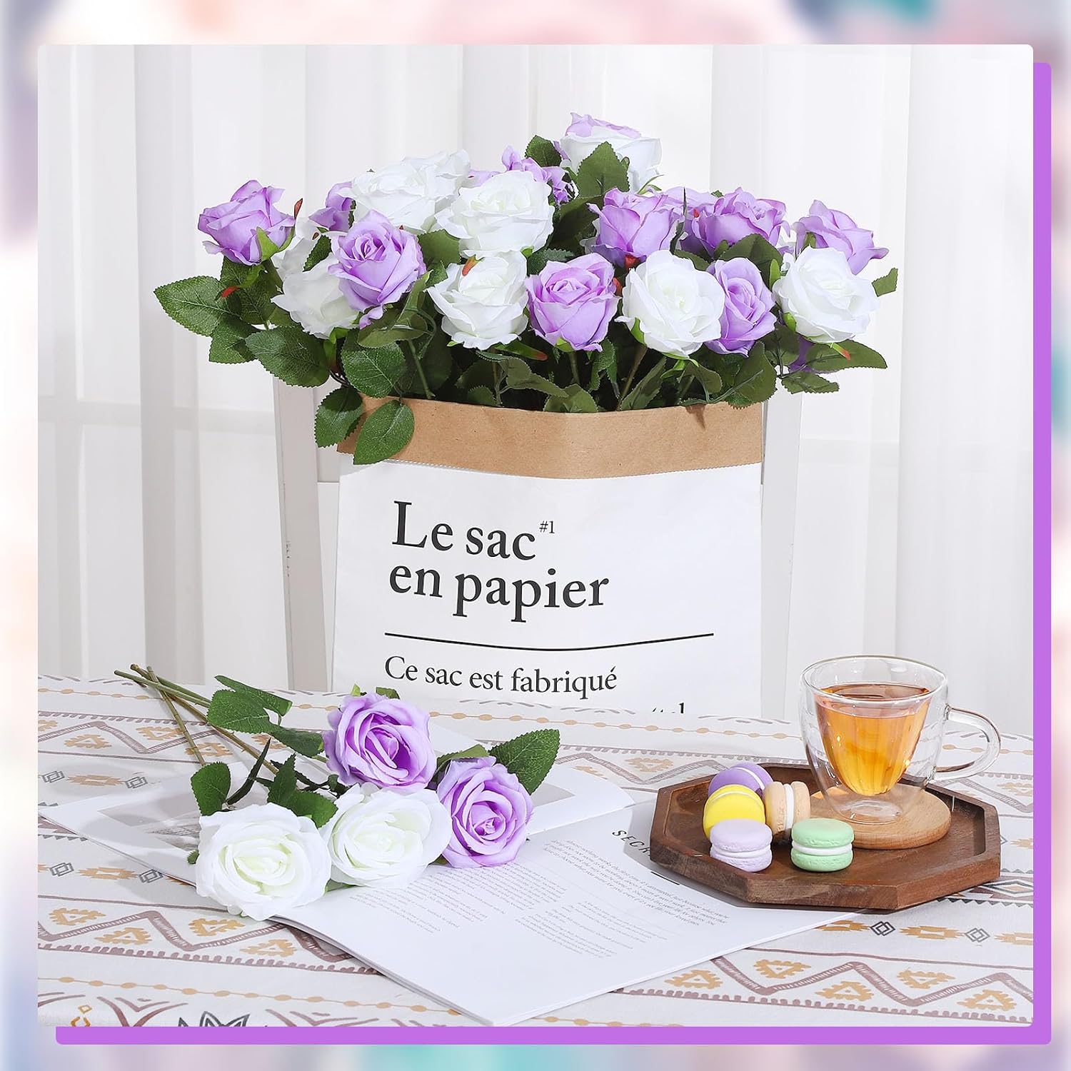 - Life-like appearance:you will receive 36 fake roses, which are 18 purple roses and 18 white roses, ample quantity of artificial roses with stems, realistic appearance and soft touch, bright colour and realistic petals add a touch of elegance and beauty to any space