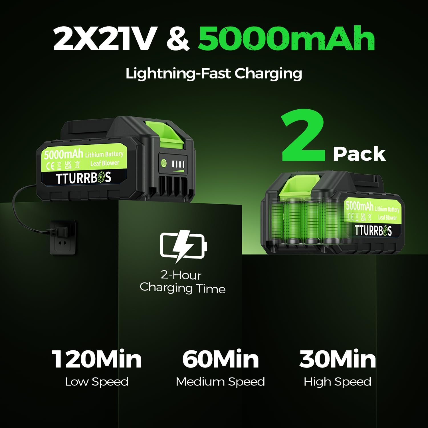 - đăLong-Lasting Power & Fast ChargingăOur cordless leaf blower with battery and charger delivers extended runtime and turbo performance. With dual 5.0Ah 21V lithium batteries, it runs for 120 minutes at low speed (30 minutes high speed) and features a 4-stage battery indicator (25%-50%-75%-100%) for real-time tracking. The advanced battery system ensures strong, steady airflow with no power loss, and the included fast charger fully powers your leaf blower in just 2 hours