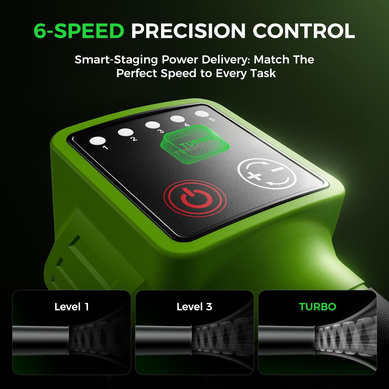 - đă6-Speed Power Settings for Every TaskăMaster every yard task with our professional leaf blower cordless featuring 6 precision speeds. Five adjustable settings (80-160 MPH) easily handle everything from patio dust to wet leaves, while Turbo mode delivers a powerful 180 MPH for tough debris. The 6-speed system maximizes battery life:lower speeds extend runtime for light work, while Turbo mode provides instant power when neededâgiving you complete control over performance and efficiency