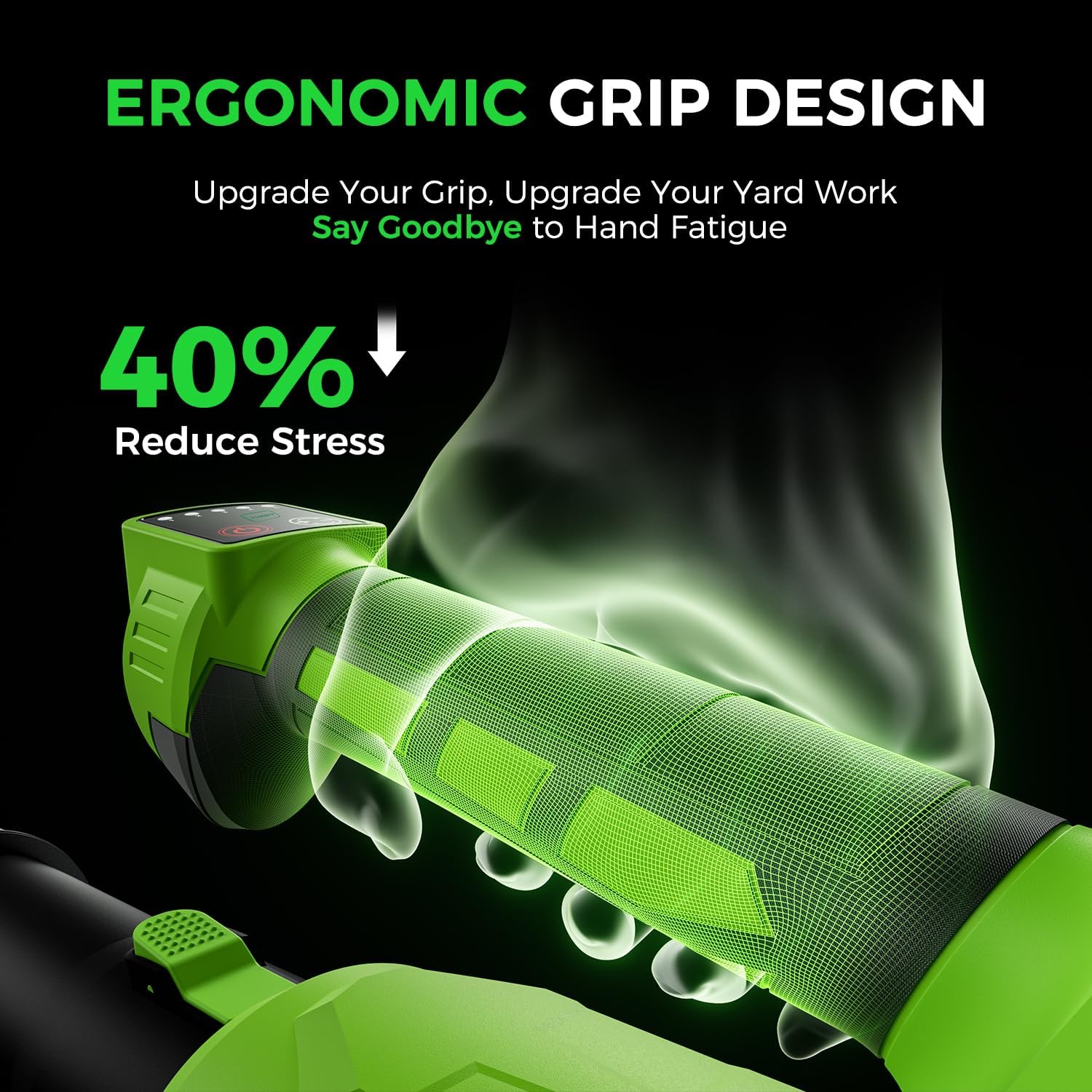 - đăErgonomic Grip DesignâSay Goodbye to Hand FatigueăTired of hand fatigue and discomfort while tackling yard work? Our cordless leaf blower is designed with a comfortable, ergonomic grip that reduces strain and vibration. The soft-touch grip provides steady control, even during prolonged useâsay goodbye to sore hands! Perfect for homeowners who demand both power and ease of use, these blowers for lawn care help you achieve a pristine yard without the aches